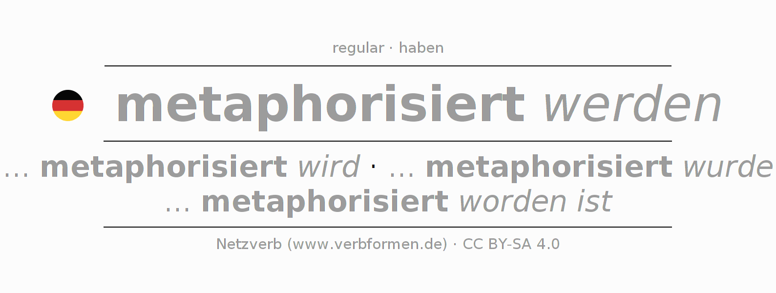 The conjugation of metaphorisieren in Imperative Present Imperative Passive is -, -, -, -.The conjugation corresponds to certain grammatical rules. Likewise the requirements for the conjugation of the simple verb forms of metaphorisieren in Imperative. Comments ☆