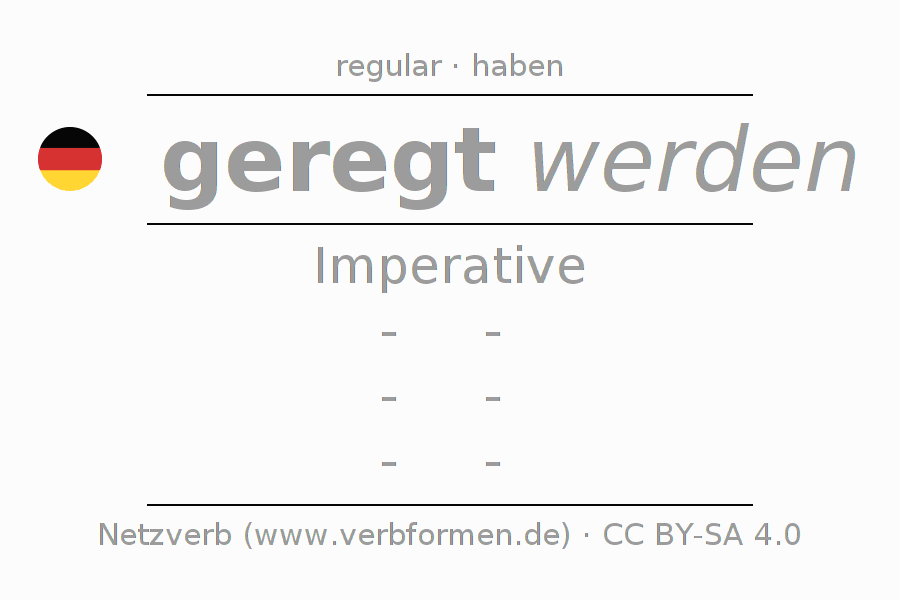 The conjugation of regen in Imperative Present Imperative Passive is -, -, -, -.The conjugation corresponds to certain grammatical rules. Likewise the requirements for the conjugation of the simple verb forms of regen in Imperative. Comments ☆
