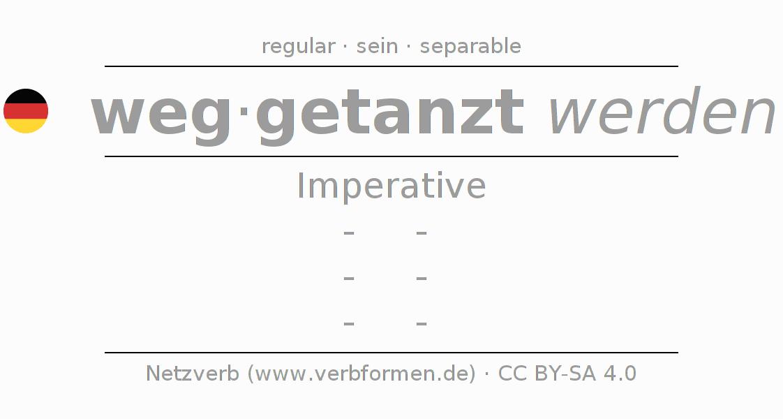 The conjugation of wegtanzen in Imperative Present Imperative Passive is -, -, -, -.The conjugation corresponds to certain grammatical rules. Likewise the requirements for the conjugation of the simple verb forms of wegtanzen in Imperative. Comments ☆
