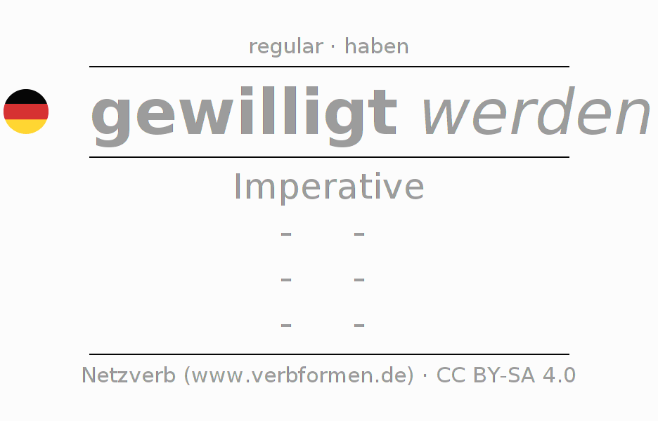 The conjugation of willigen in Imperative Present Imperative Passive is -, -, -, -.The conjugation corresponds to certain grammatical rules. Likewise the requirements for the conjugation of the simple verb forms of willigen in Imperative. Comments ☆