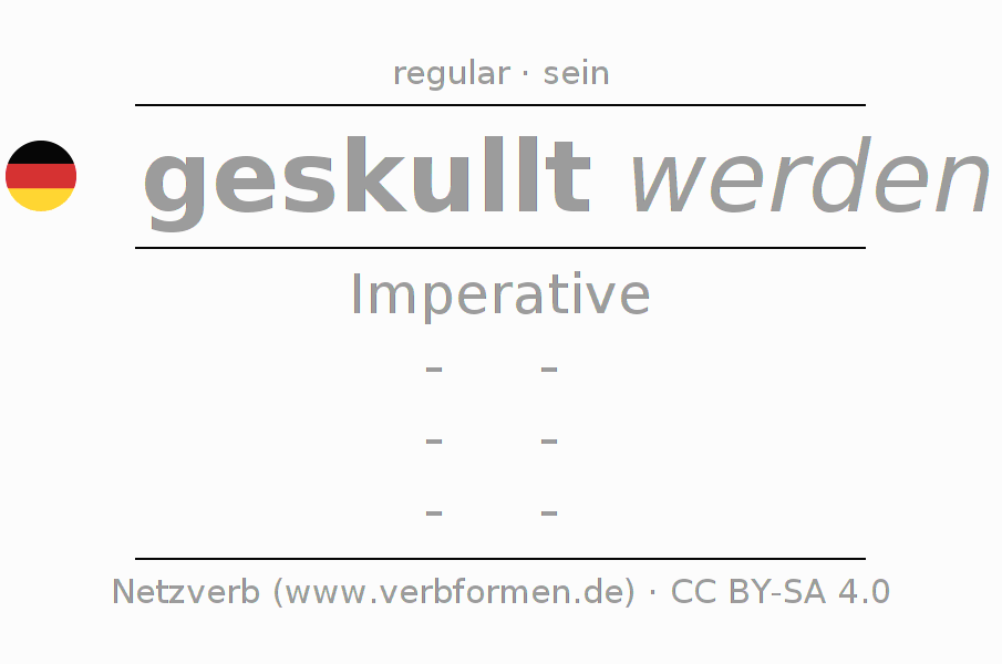 The conjugation of skullen in Imperative Present Imperative Passive is -, -, -, -.The conjugation corresponds to certain grammatical rules. Likewise the requirements for the conjugation of the simple verb forms of skullen in Imperative. Comments ☆