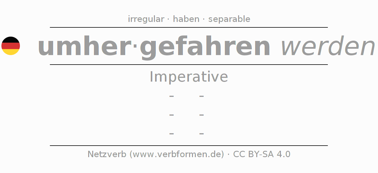 The conjugation of umherfahren in Imperative Present Imperative Passive is -, -, -, -.The conjugation corresponds to certain grammatical rules. Likewise the requirements for the conjugation of the simple verb forms of umherfahren in Imperative. Comments ☆