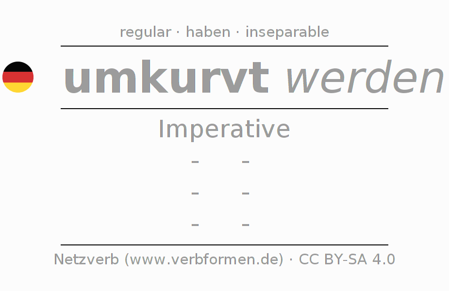 The conjugation of umkurven in Imperative Present Imperative Passive is -, -, -, -.The conjugation corresponds to certain grammatical rules. Likewise the requirements for the conjugation of the simple verb forms of umkurven in Imperative. Comments ☆