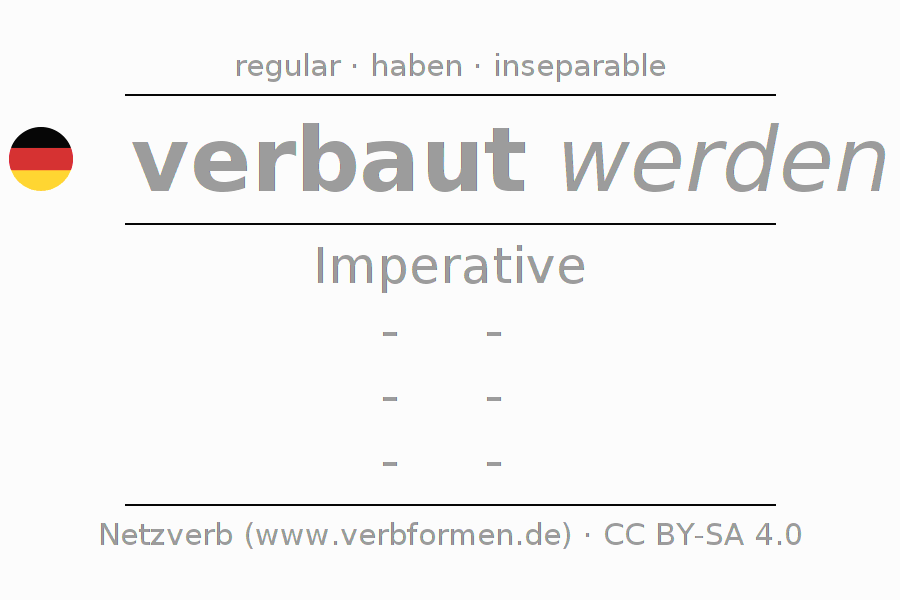 The conjugation of verbauen in Imperative Present Imperative Passive is -, -, -, -.The conjugation corresponds to certain grammatical rules. Likewise the requirements for the conjugation of the simple verb forms of verbauen in Imperative. Comments ☆