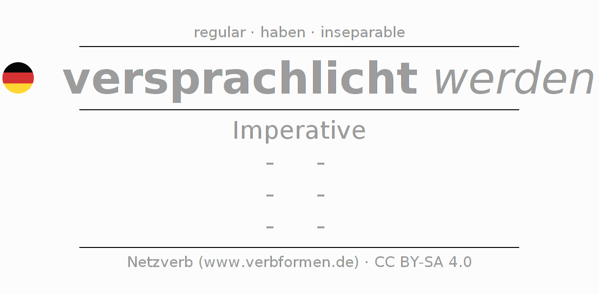 The conjugation of versprachlichen in Imperative Present Imperative Passive is -, -, -, -.The conjugation corresponds to certain grammatical rules. Likewise the requirements for the conjugation of the simple verb forms of versprachlichen in Imperative. Comments ☆