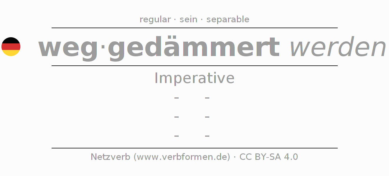 The conjugation of wegdämmern in Imperative Present Imperative Passive is -, -, -, -.The conjugation corresponds to certain grammatical rules. Likewise the requirements for the conjugation of the simple verb forms of wegdämmern in Imperative. Comments ☆