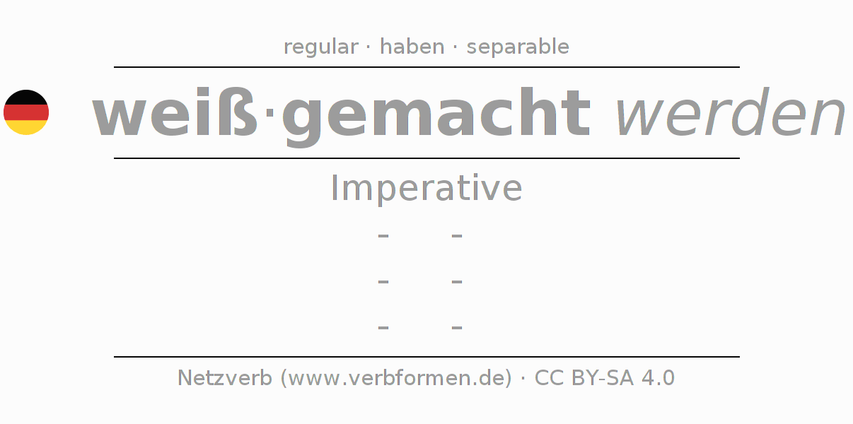 The conjugation of weißmachen in Imperative Present Imperative Passive is -, -, -, -.The conjugation corresponds to certain grammatical rules. Likewise the requirements for the conjugation of the simple verb forms of weißmachen in Imperative. Comments ☆