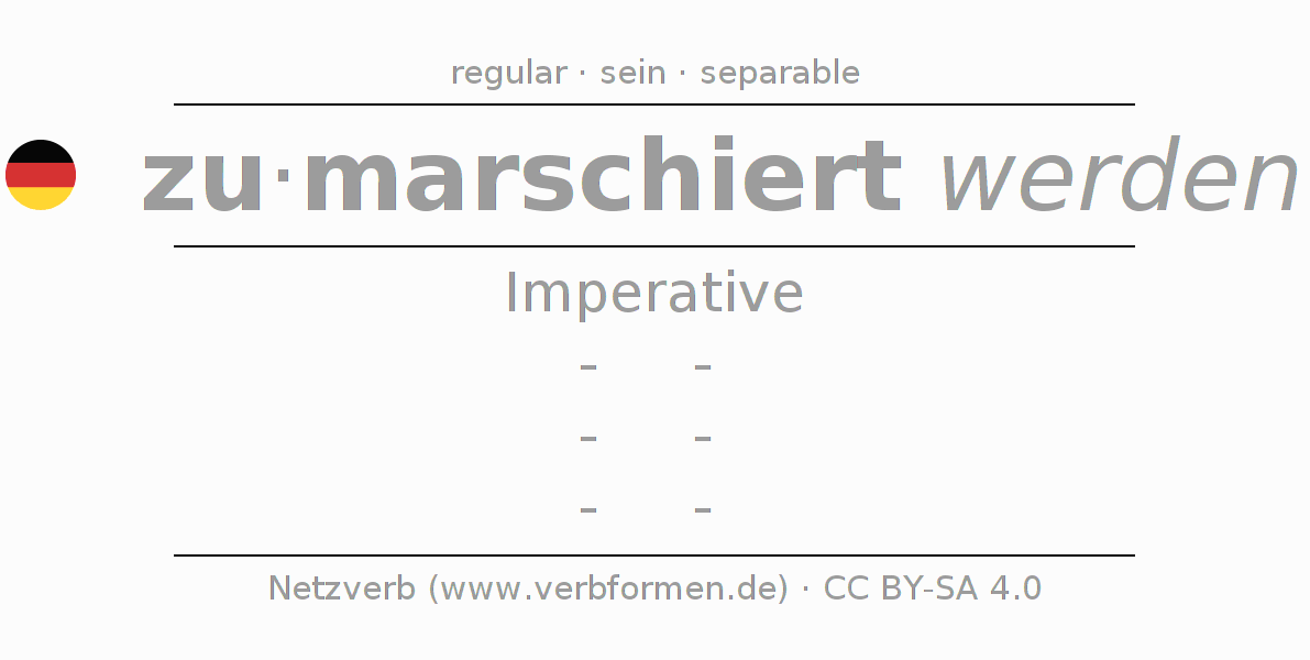The conjugation of zumarschieren in Imperative Present Imperative Passive is -, -, -, -.The conjugation corresponds to certain grammatical rules. Likewise the requirements for the conjugation of the simple verb forms of zumarschieren in Imperative. Comments ☆