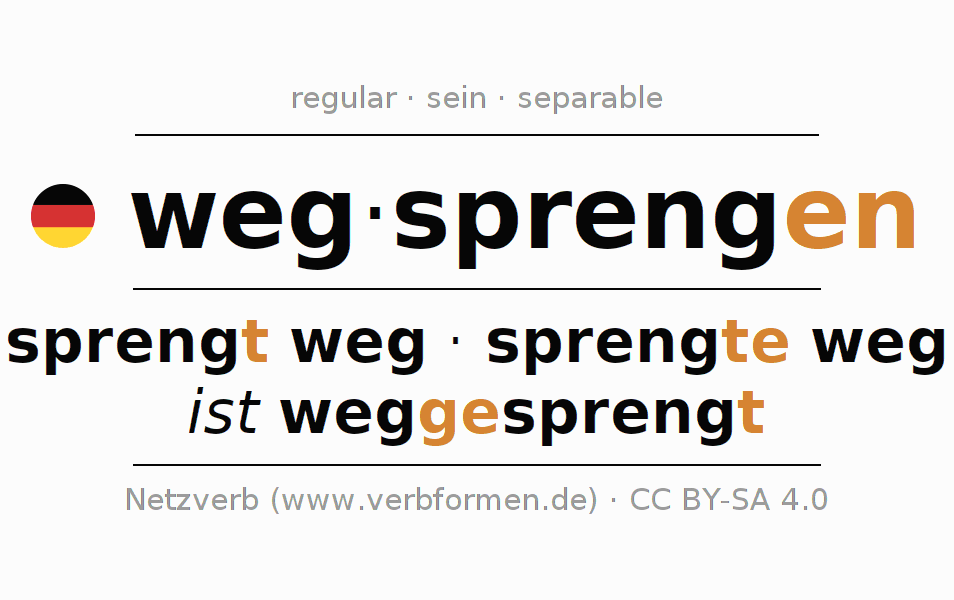 The conjugation of wegsprengen (blast away, blow away) in the imperative is: sprenge (du) weg, sprengen wir weg, sprengt (ihr) weg, sprengen Sie weg. The imperative is formed with the stem of present tense spreng. The endings -e, -en, -t, -en are appended to the stem. The prefix weg- of wegsprengen is separated.The personal pronoun is usually omitted in the 2nd person singular.The formation of the forms corresponds to the grammatical rules for the conjugation of the verbs in imperative. Comments ☆