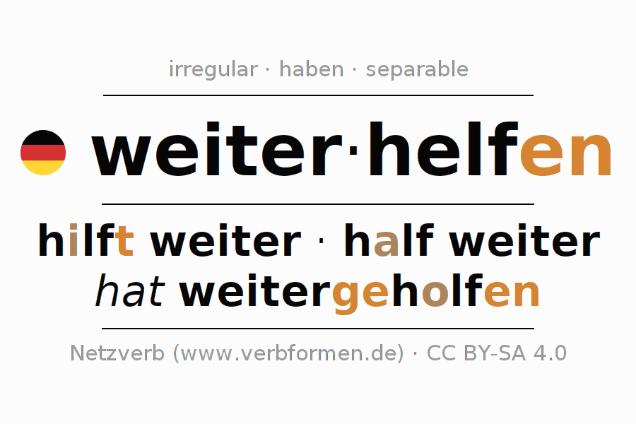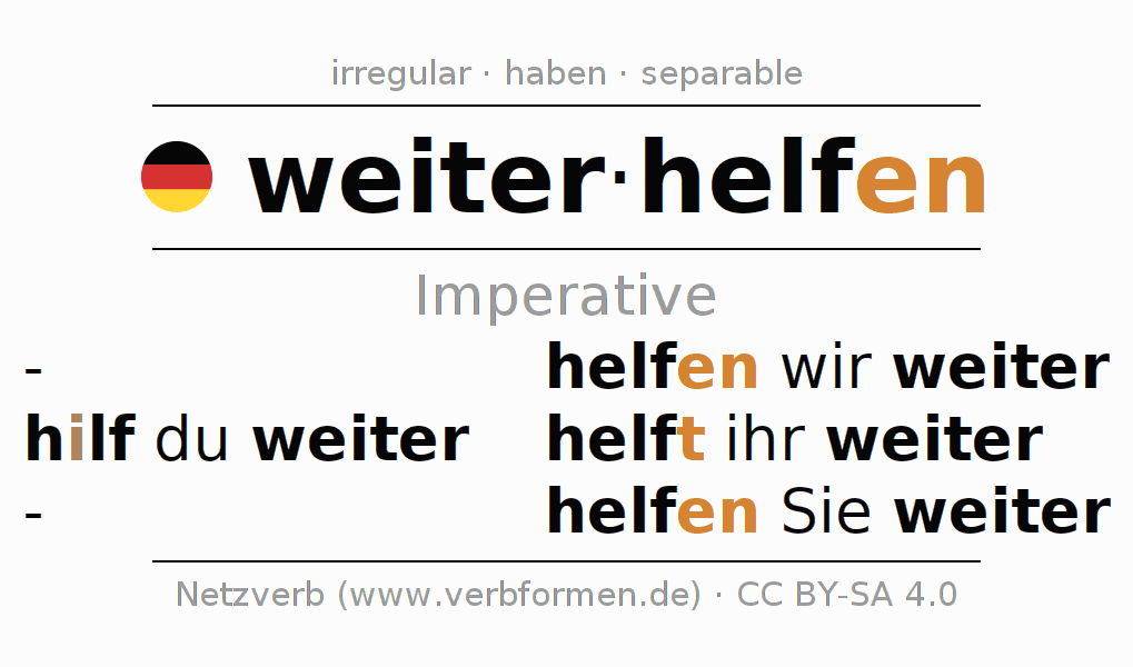 The conjugation of weiterhelfen (assist, help) in the imperative is: hilf (du) weiter, helfen wir weiter, helft (ihr) weiter, helfen Sie weiter. The imperative is formed with the stem of present tense helf. As an irregular verb there is the changed stem hilf in the second person singular. The endings -, -en, -t, -en are appended to the stem. The ending of the 2nd person singular has been shortened by one e, as the stem ends on i. The prefix weiter- of weiterhelfen is separated.The personal pronoun is usually omitted in the 2nd person singular.The formation of the forms corresponds to the grammatical rules for the conjugation of the verbs in imperative. Comments ☆