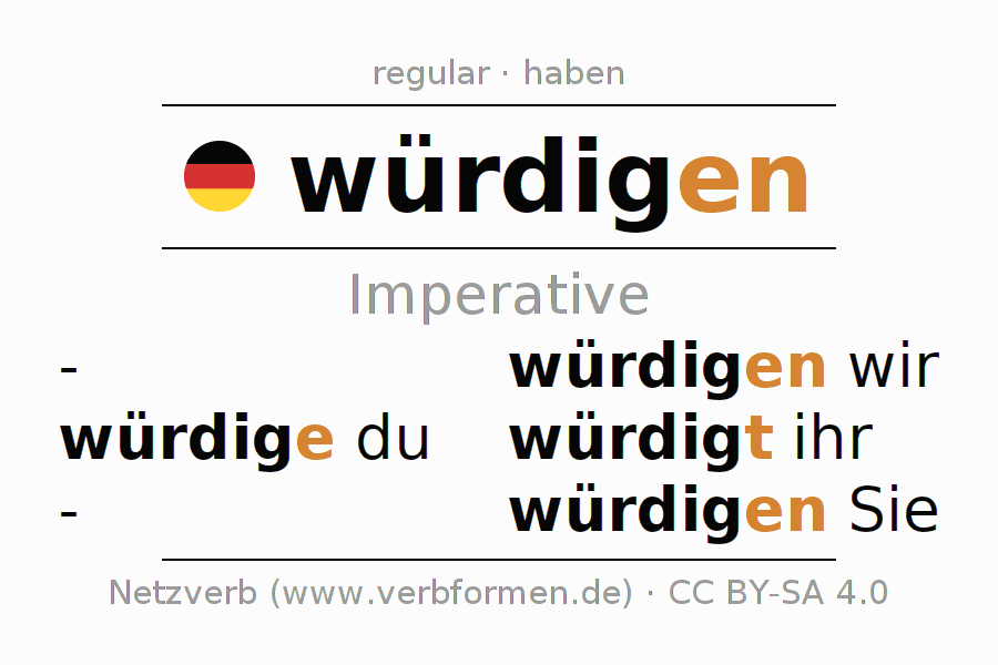 The conjugation of würdigen (appreciate, acknowledge) in the imperative is: würdige (du), würdigen wir, würdigt (ihr), würdigen Sie. The imperative is formed with the stem of present tense würdig. The endings -e, -en, -t, -en are appended to the stem. The personal pronoun is usually omitted in the 2nd person singular.The formation of the forms corresponds to the grammatical rules for the conjugation of the verbs in imperative. Comments ☆