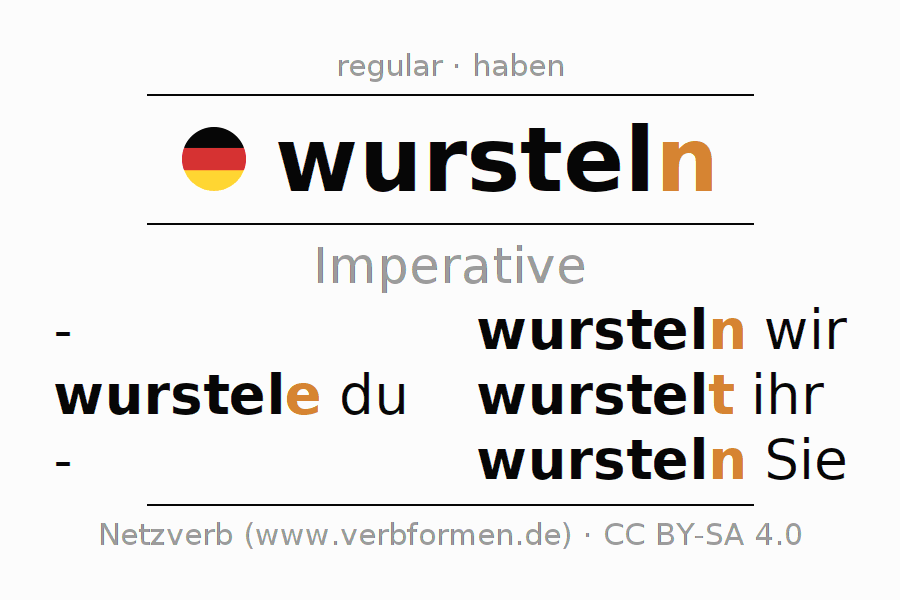 The conjugation of wursteln (fumble, mess around) in the imperative is: wurst(e)le (du), wursteln wir, wurstelt (ihr), wursteln Sie. The imperative is formed with the stem of present tense wurstel. The endings -e, -n, -t, -n are appended to the stem. The endings in the 1st and 3rd person plural are shortened by e, since the verb ends with -ern. The personal pronoun is usually omitted in the 2nd person singular.The formation of the forms corresponds to the grammatical rules for the conjugation of the verbs in imperative. Comments ☆