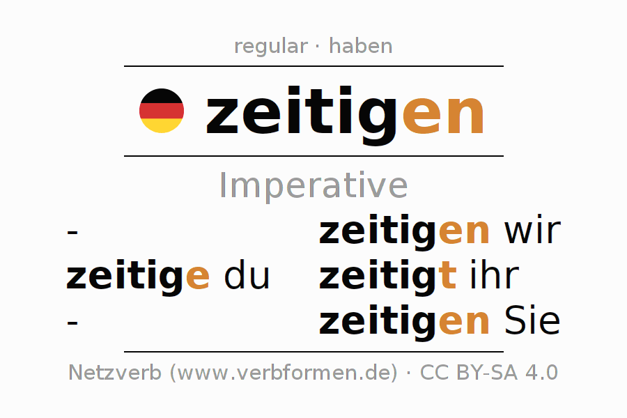 The verb zeitigen fully conjugated in all persons and numbers in the Imperative Present