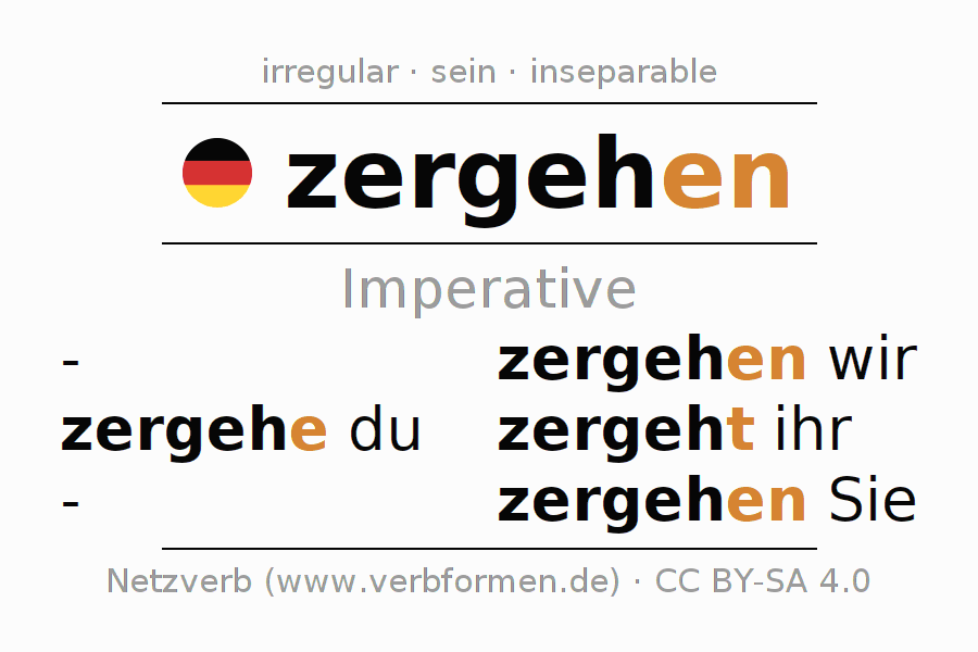 The verb zergehen fully conjugated in all persons and numbers in the Imperative Present