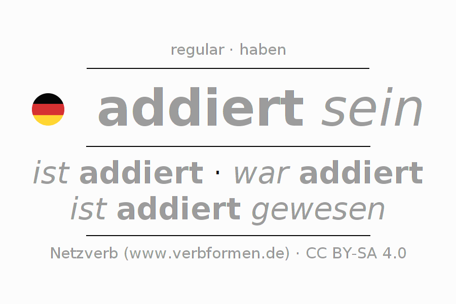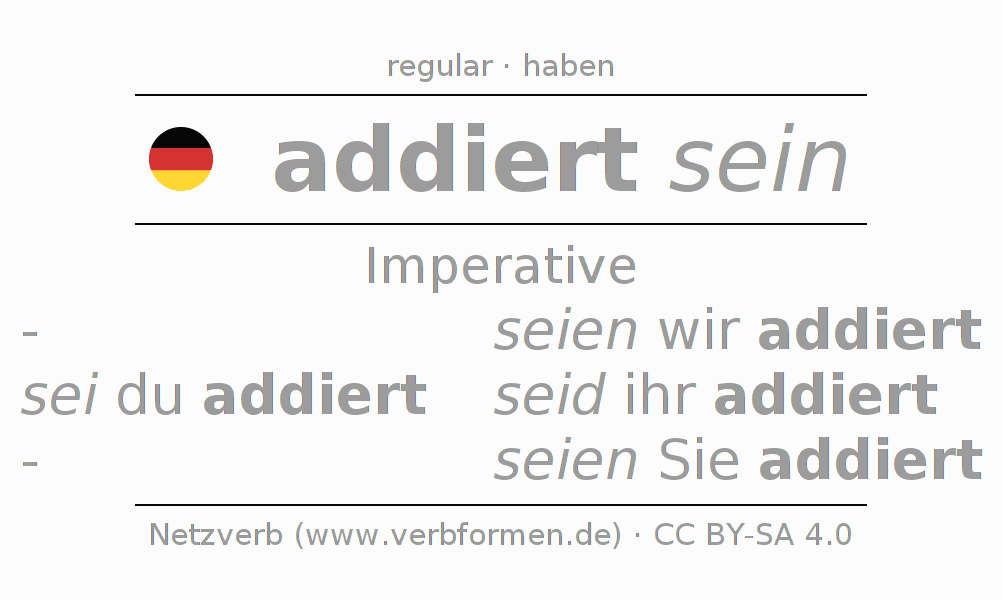The conjugation of addieren in Imperative Present Imperative Statal Passive is sei (du) addiert, seien wir addiert, seid (ihr) addiert, seien Sie addiert.The conjugation corresponds to certain grammatical rules. Likewise the requirements for the conjugation of the simple verb forms of addieren in Imperative. Comments ☆