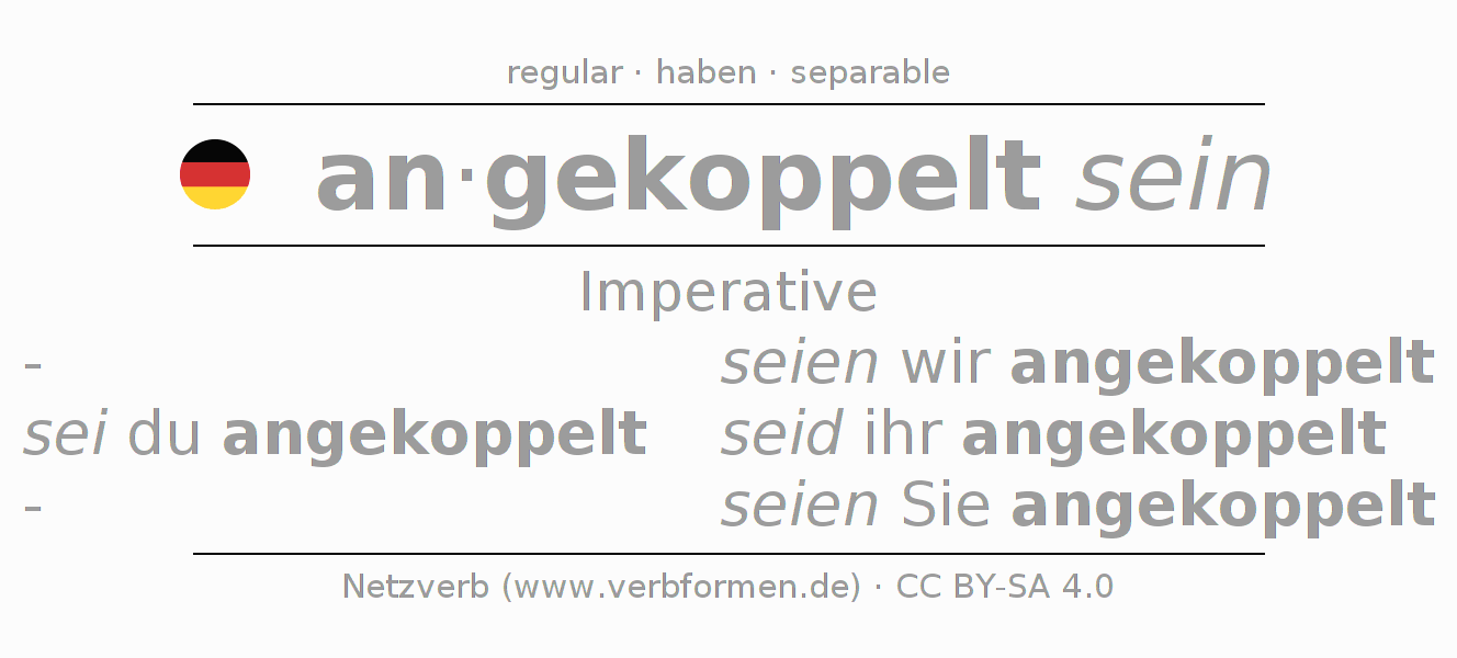 The conjugation of ankoppeln in Imperative Present Imperative Statal Passive is sei (du) angekoppelt, seien wir angekoppelt, seid (ihr) angekoppelt, seien Sie angekoppelt.The conjugation corresponds to certain grammatical rules. Likewise the requirements for the conjugation of the simple verb forms of ankoppeln in Imperative. Comments ☆