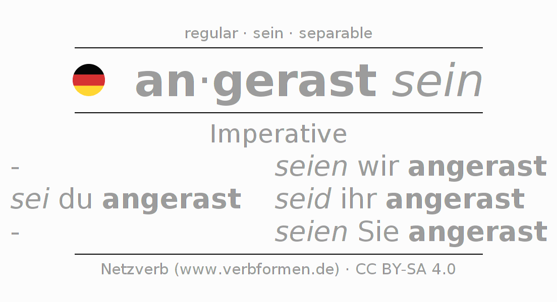The conjugation of anrasen in Imperative Present Imperative Statal Passive is sei (du) angerast, seien wir angerast, seid (ihr) angerast, seien Sie angerast.The conjugation corresponds to certain grammatical rules. Likewise the requirements for the conjugation of the simple verb forms of anrasen in Imperative. Comments ☆