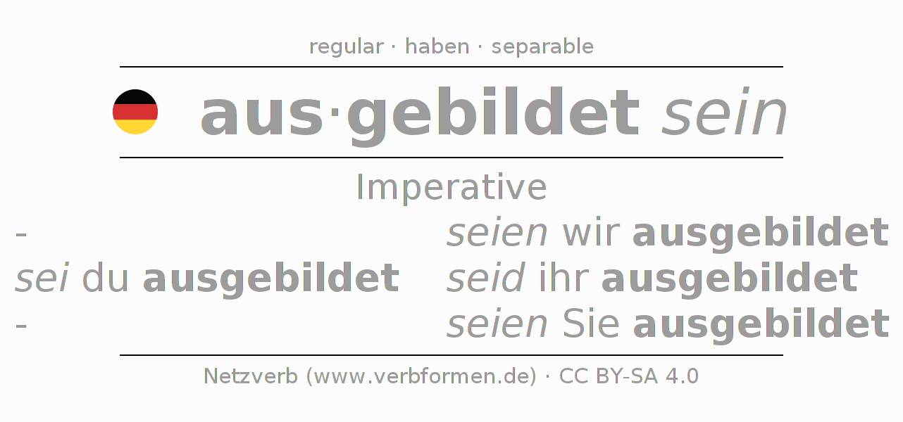 The conjugation of ausbilden in Imperative Present Imperative Statal Passive is sei (du) ausgebildet, seien wir ausgebildet, seid (ihr) ausgebildet, seien Sie ausgebildet.The conjugation corresponds to certain grammatical rules. Likewise the requirements for the conjugation of the simple verb forms of ausbilden in Imperative. Comments ☆