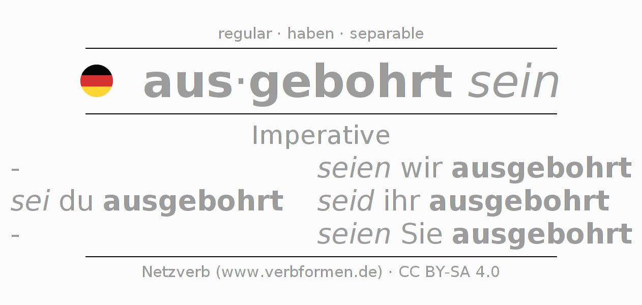 The conjugation of ausbohren in Imperative Present Imperative Statal Passive is sei (du) ausgebohrt, seien wir ausgebohrt, seid (ihr) ausgebohrt, seien Sie ausgebohrt.The conjugation corresponds to certain grammatical rules. Likewise the requirements for the conjugation of the simple verb forms of ausbohren in Imperative. Comments ☆