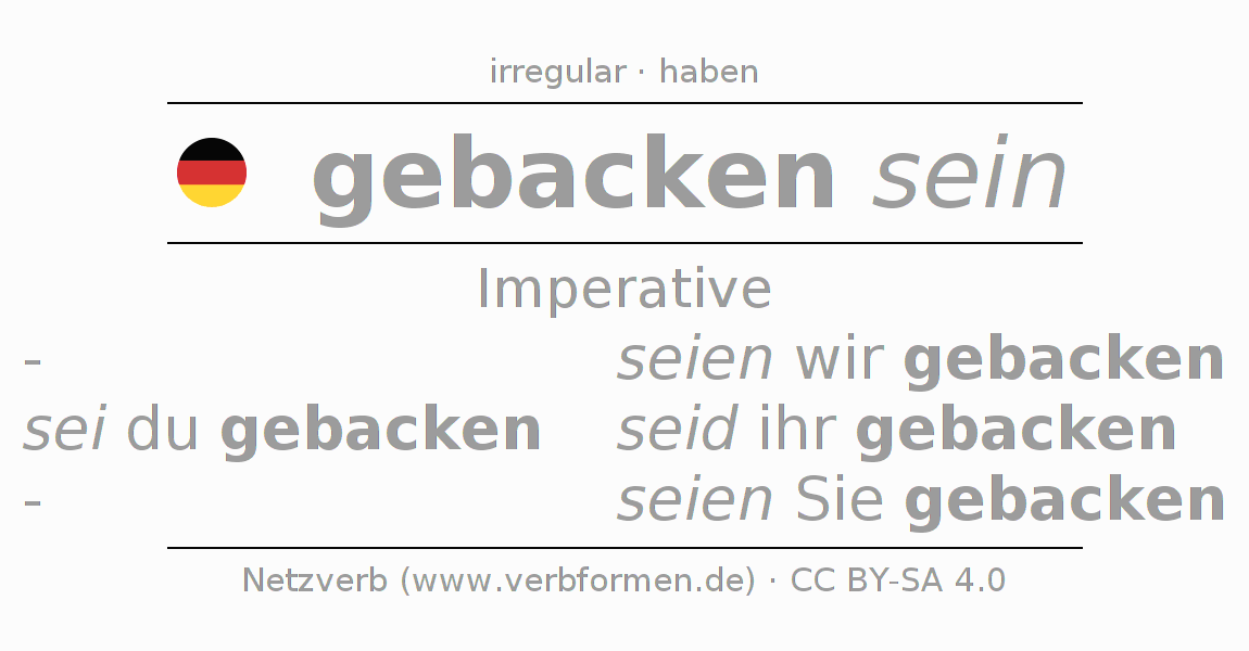 The conjugation of backen in Imperative Present Imperative Statal Passive is sei (du) gebacken, seien wir gebacken, seid (ihr) gebacken, seien Sie gebacken.The conjugation corresponds to certain grammatical rules. Likewise the requirements for the conjugation of the simple verb forms of backen in Imperative. Comments ☆