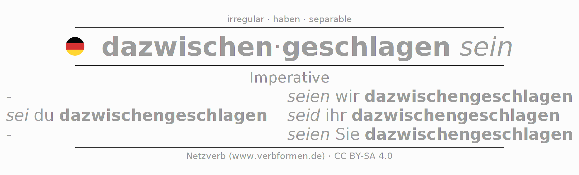 The verb dazwischenschlagen fully conjugated in all persons and numbers in the Imperative Present