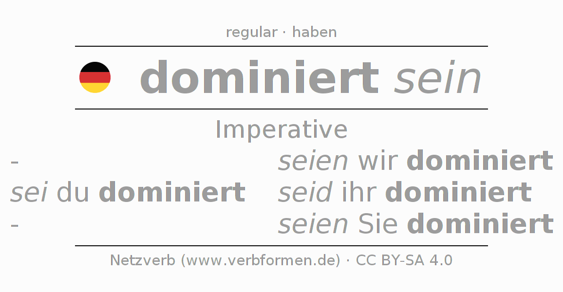 The verb dominieren fully conjugated in all persons and numbers in the Imperative Present