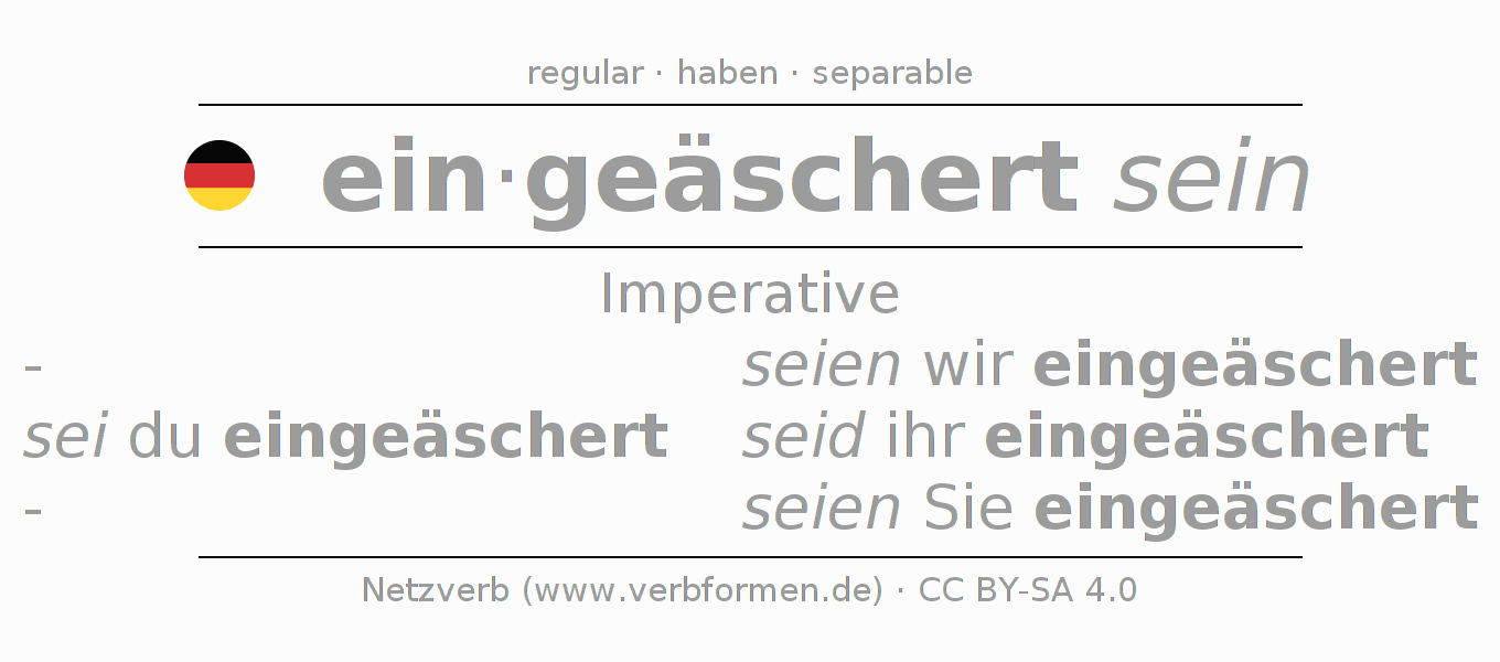 The conjugation of einäschern in Imperative Present Imperative Statal Passive is sei (du) eingeäschert, seien wir eingeäschert, seid (ihr) eingeäschert, seien Sie eingeäschert.The conjugation corresponds to certain grammatical rules. Likewise the requirements for the conjugation of the simple verb forms of einäschern in Imperative. Comments ☆