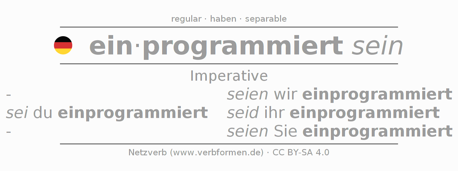 The verb einprogrammieren fully conjugated in all persons and numbers in the Imperative Present