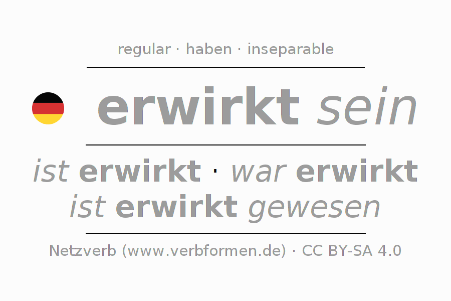 The conjugation of erwirken in Imperative Present Imperative Statal Passive is sei (du) erwirkt, seien wir erwirkt, seid (ihr) erwirkt, seien Sie erwirkt.The conjugation corresponds to certain grammatical rules. Likewise the requirements for the conjugation of the simple verb forms of erwirken in Imperative. Comments ☆