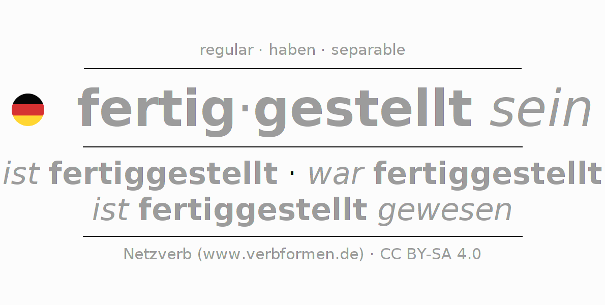 The conjugation of fertigstellen in Imperative Present Imperative Statal Passive is sei (du) fertiggestellt, seien wir fertiggestellt, seid (ihr) fertiggestellt, seien Sie fertiggestellt.The conjugation corresponds to certain grammatical rules. Likewise the requirements for the conjugation of the simple verb forms of fertigstellen in Imperative. Comments ☆