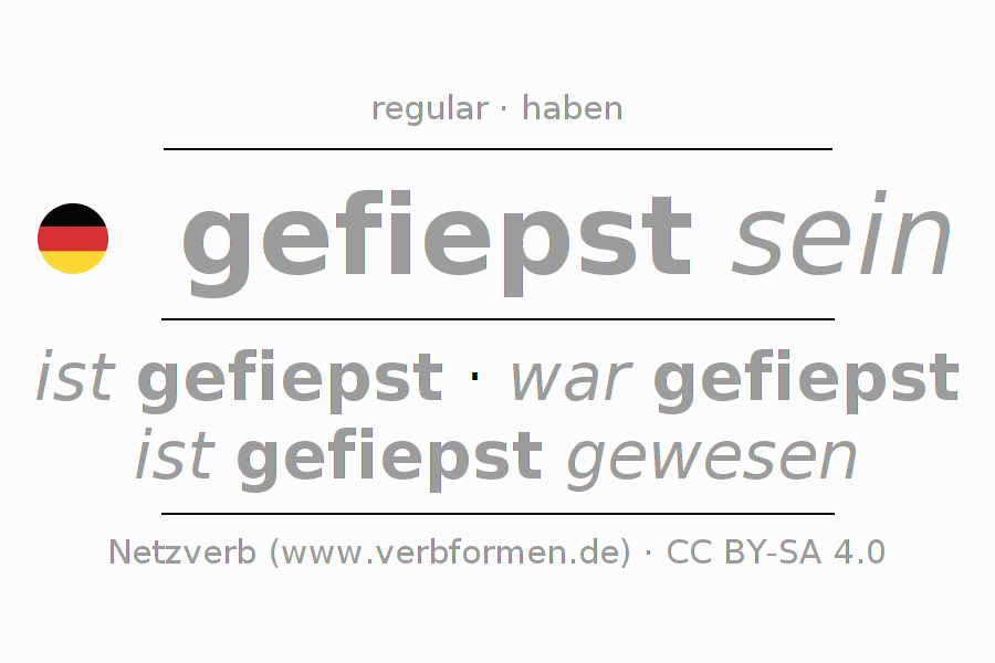 The conjugation of fiepsen in Imperative Present Imperative Statal Passive is sei (du) gefiepst, seien wir gefiepst, seid (ihr) gefiepst, seien Sie gefiepst.The conjugation corresponds to certain grammatical rules. Likewise the requirements for the conjugation of the simple verb forms of fiepsen in Imperative. Comments ☆
