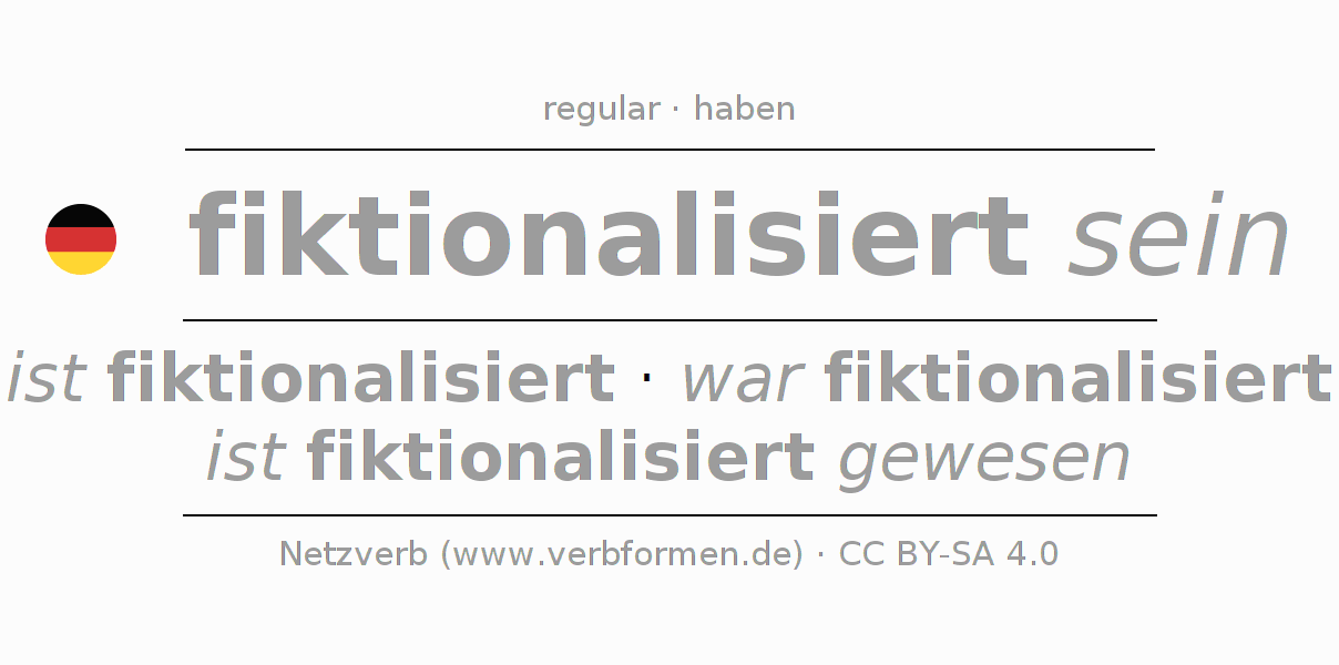 The conjugation of fiktionalisieren in Imperative Present Imperative Statal Passive is sei (du) fiktionalisiert, seien wir fiktionalisiert, seid (ihr) fiktionalisiert, seien Sie fiktionalisiert.The conjugation corresponds to certain grammatical rules. Likewise the requirements for the conjugation of the simple verb forms of fiktionalisieren in Imperative. Comments ☆