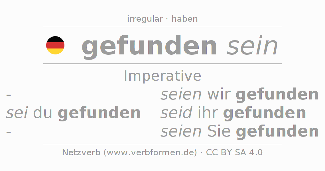 The conjugation of finden in Imperative Present Imperative Statal Passive is sei (du) gefunden, seien wir gefunden, seid (ihr) gefunden, seien Sie gefunden.The conjugation corresponds to certain grammatical rules. Likewise the requirements for the conjugation of the simple verb forms of finden in Imperative. 1Comment ☆5.0