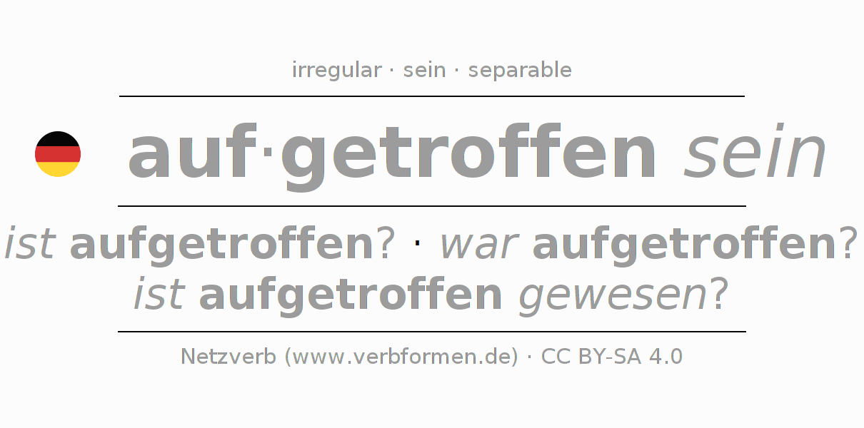 The conjugation of auftreffen in Imperative Present Imperative Statal Passive is sei (du) aufgetroffen, seien wir aufgetroffen, seid (ihr) aufgetroffen, seien Sie aufgetroffen.The conjugation corresponds to certain grammatical rules. Likewise the requirements for the conjugation of the simple verb forms of auftreffen in Imperative. Comments ☆