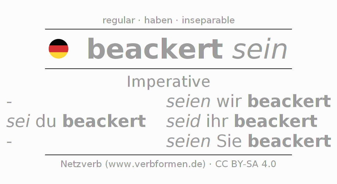 The conjugation of beackern in Imperative Present Imperative Statal Passive is sei (du) beackert, seien wir beackert, seid (ihr) beackert, seien Sie beackert.The conjugation corresponds to certain grammatical rules. Likewise the requirements for the conjugation of the simple verb forms of beackern in Imperative. Comments ☆