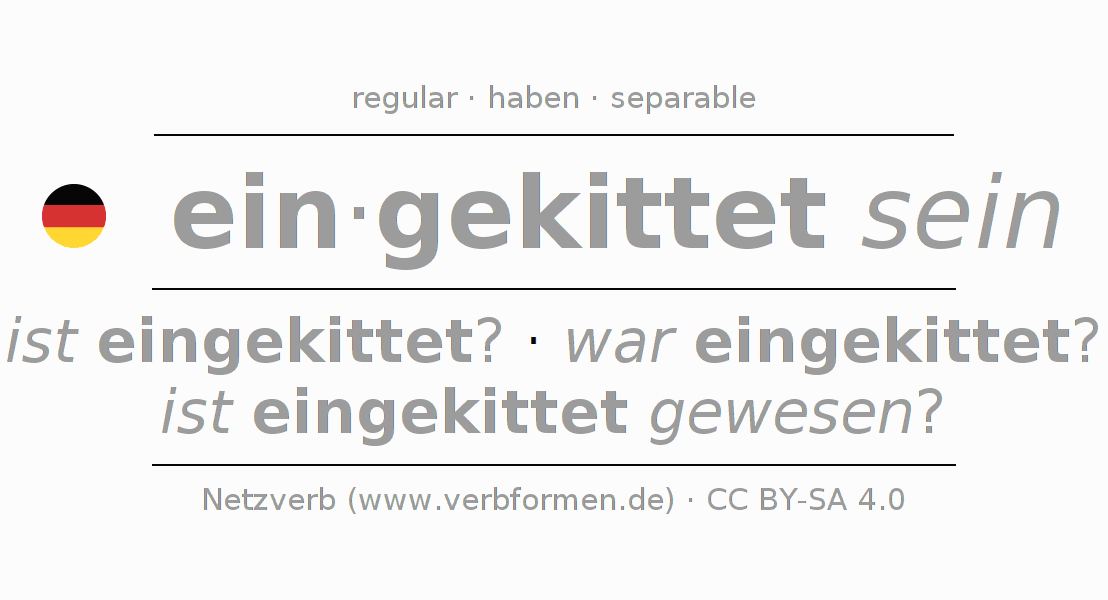 The conjugation of einkitten in Imperative Present Imperative Statal Passive is sei (du) eingekittet, seien wir eingekittet, seid (ihr) eingekittet, seien Sie eingekittet.The conjugation corresponds to certain grammatical rules. Likewise the requirements for the conjugation of the simple verb forms of einkitten in Imperative. Comments ☆