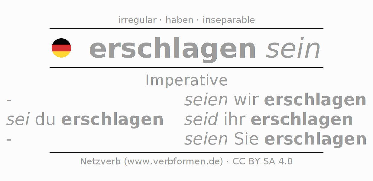 The conjugation of erschlagen in Imperative Present Imperative Statal Passive is sei (du) erschlagen, seien wir erschlagen, seid (ihr) erschlagen, seien Sie erschlagen.The conjugation corresponds to certain grammatical rules. Likewise the requirements for the conjugation of the simple verb forms of erschlagen in Imperative. Comments ☆
