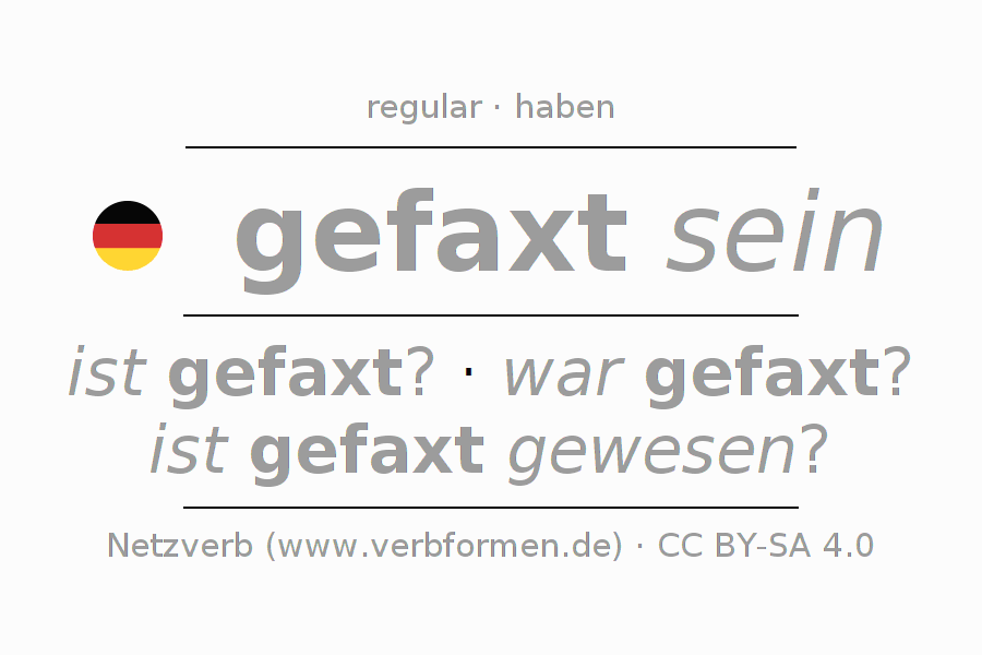 The conjugation of faxen in Imperative Present Imperative Statal Passive is sei (du) gefaxt, seien wir gefaxt, seid (ihr) gefaxt, seien Sie gefaxt.The conjugation corresponds to certain grammatical rules. Likewise the requirements for the conjugation of the simple verb forms of faxen in Imperative. Comments ☆
