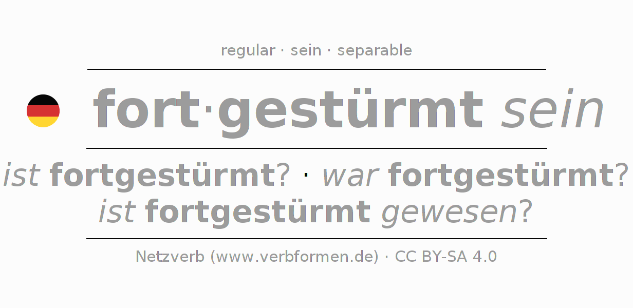 The conjugation of fortstürmen in Imperative Present Imperative Statal Passive is sei (du) fortgestürmt, seien wir fortgestürmt, seid (ihr) fortgestürmt, seien Sie fortgestürmt.The conjugation corresponds to certain grammatical rules. Likewise the requirements for the conjugation of the simple verb forms of fortstürmen in Imperative. Comments ☆
