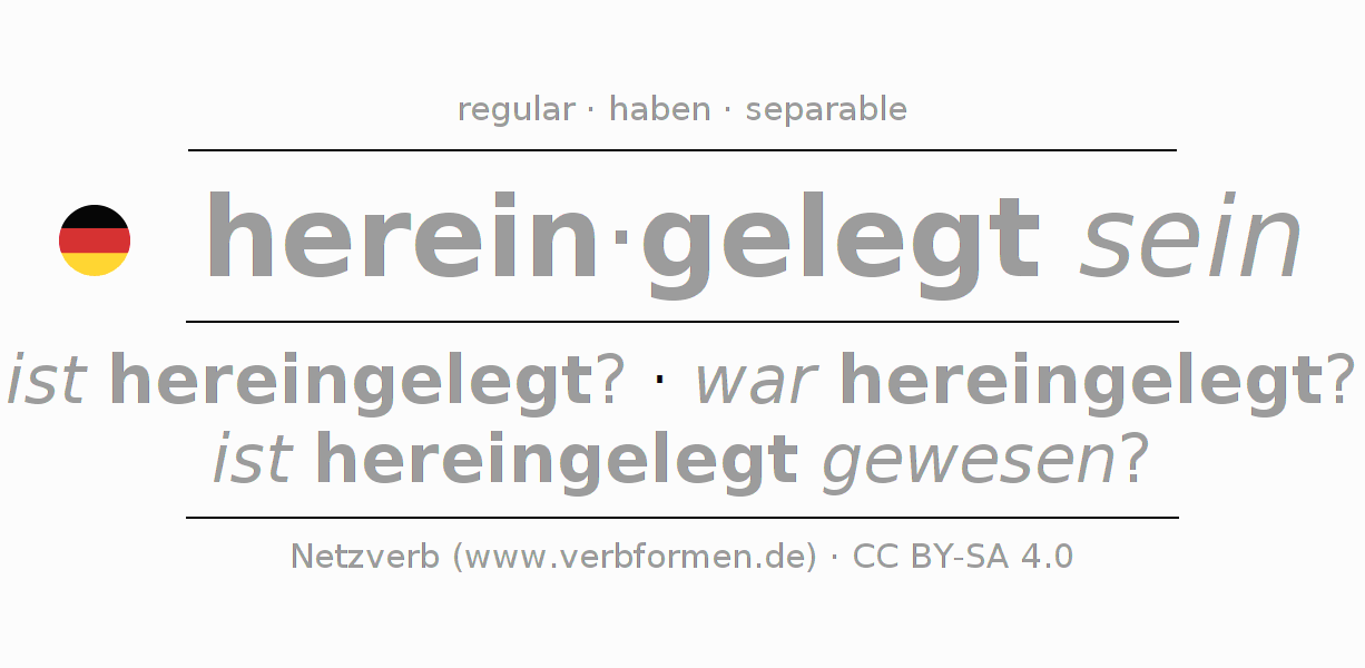 The conjugation of hereinlegen in Imperative Present Imperative Statal Passive is sei (du) hereingelegt, seien wir hereingelegt, seid (ihr) hereingelegt, seien Sie hereingelegt.The conjugation corresponds to certain grammatical rules. Likewise the requirements for the conjugation of the simple verb forms of hereinlegen in Imperative. Comments ☆
