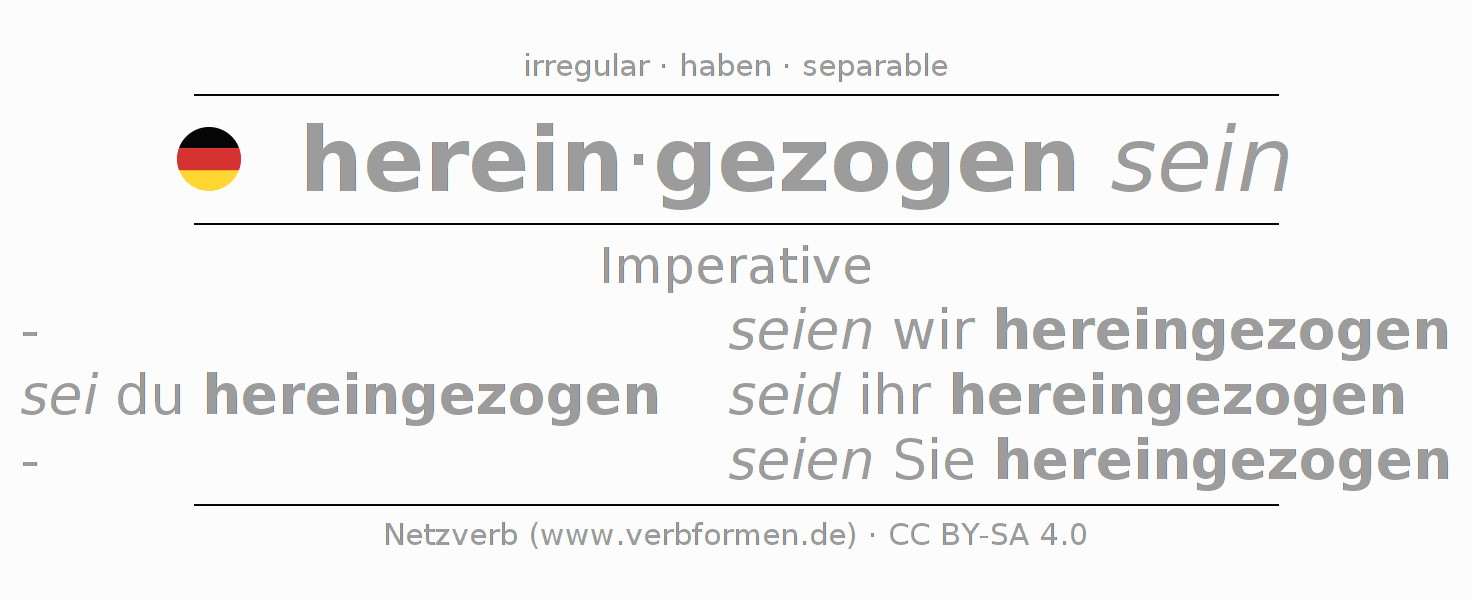 The conjugation of hereinziehen in Imperative Present Imperative Statal Passive is sei (du) hereingezogen, seien wir hereingezogen, seid (ihr) hereingezogen, seien Sie hereingezogen.The conjugation corresponds to certain grammatical rules. Likewise the requirements for the conjugation of the simple verb forms of hereinziehen in Imperative. Comments ☆