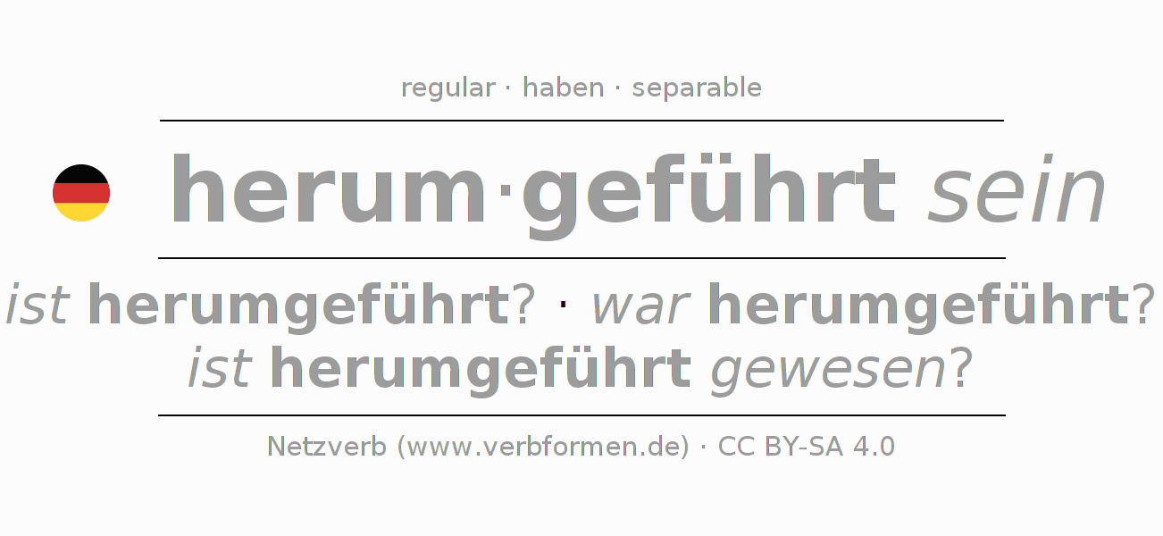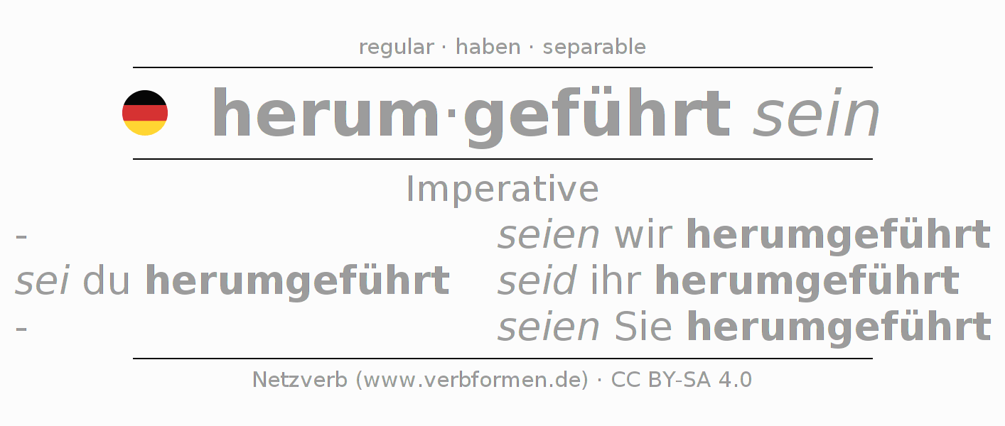 The conjugation of herumführen in Imperative Present Imperative Statal Passive is sei (du) herumgeführt, seien wir herumgeführt, seid (ihr) herumgeführt, seien Sie herumgeführt.The conjugation corresponds to certain grammatical rules. Likewise the requirements for the conjugation of the simple verb forms of herumführen in Imperative. Comments ☆