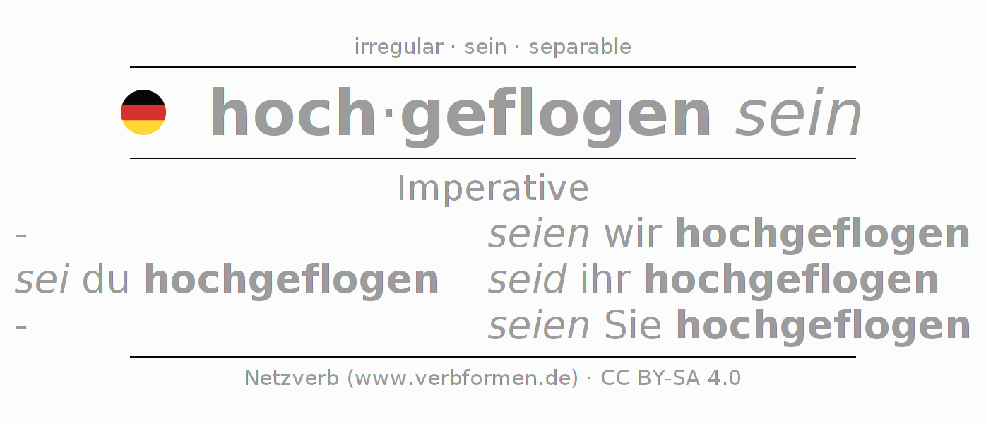 The conjugation of hochfliegen in Imperative Present Imperative Statal Passive is sei (du) hochgeflogen, seien wir hochgeflogen, seid (ihr) hochgeflogen, seien Sie hochgeflogen.The conjugation corresponds to certain grammatical rules. Likewise the requirements for the conjugation of the simple verb forms of hochfliegen in Imperative. Comments ☆