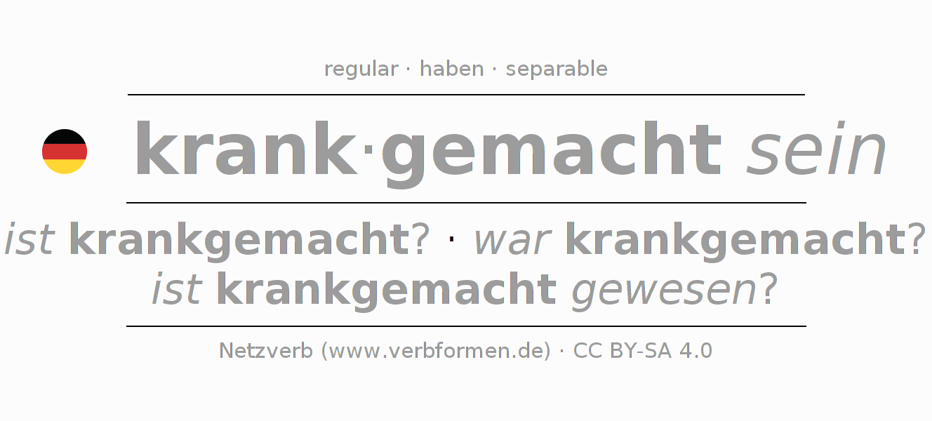 The conjugation of krankmachen in Imperative Present Imperative Statal Passive is sei (du) krankgemacht, seien wir krankgemacht, seid (ihr) krankgemacht, seien Sie krankgemacht.The conjugation corresponds to certain grammatical rules. Likewise the requirements for the conjugation of the simple verb forms of krankmachen in Imperative. Comments ☆