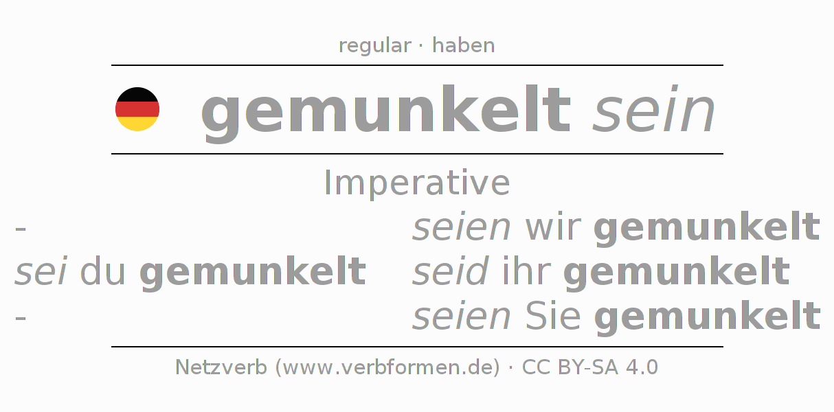 The conjugation of munkeln in Imperative Present Imperative Statal Passive is sei (du) gemunkelt, seien wir gemunkelt, seid (ihr) gemunkelt, seien Sie gemunkelt.The conjugation corresponds to certain grammatical rules. Likewise the requirements for the conjugation of the simple verb forms of munkeln in Imperative. Comments ☆