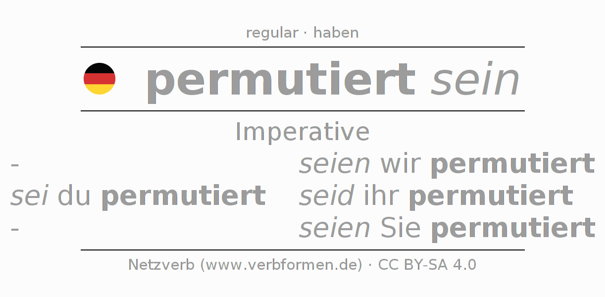 The conjugation of permutieren in Imperative Present Imperative Statal Passive is sei (du) permutiert, seien wir permutiert, seid (ihr) permutiert, seien Sie permutiert.The conjugation corresponds to certain grammatical rules. Likewise the requirements for the conjugation of the simple verb forms of permutieren in Imperative. Comments ☆
