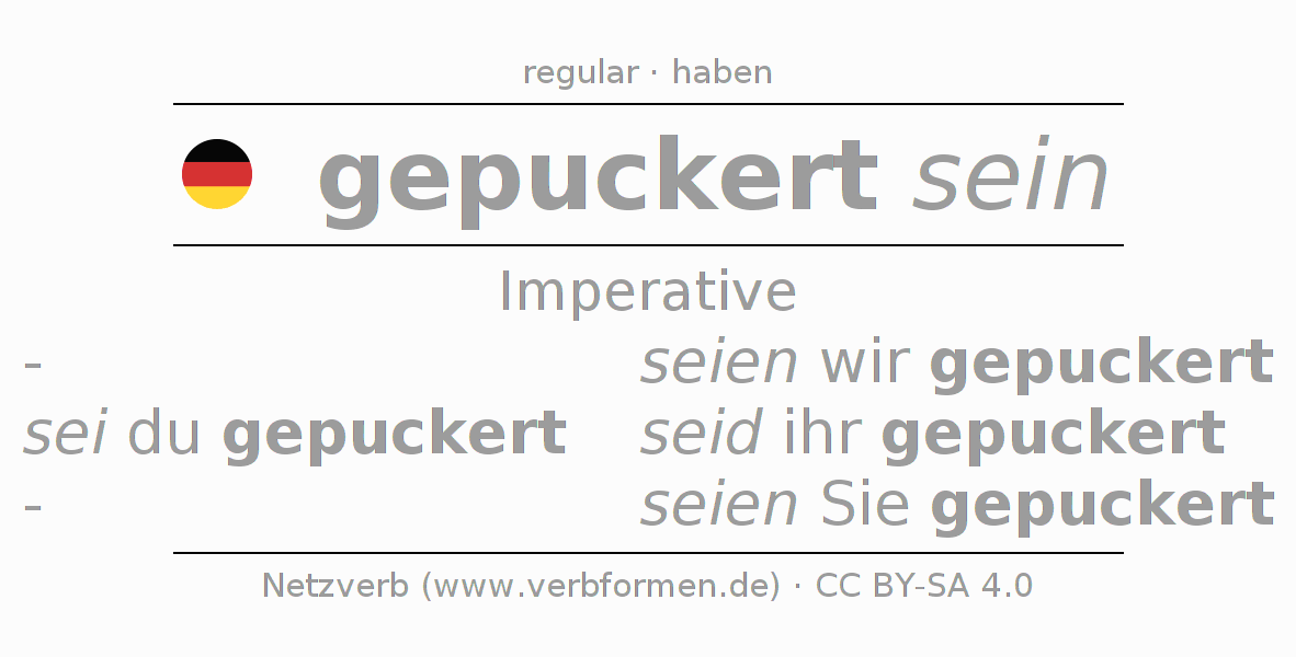 The conjugation of puckern in Imperative Present Imperative Statal Passive is sei (du) gepuckert, seien wir gepuckert, seid (ihr) gepuckert, seien Sie gepuckert.The conjugation corresponds to certain grammatical rules. Likewise the requirements for the conjugation of the simple verb forms of puckern in Imperative. Comments ☆