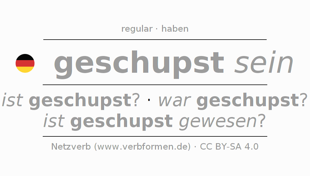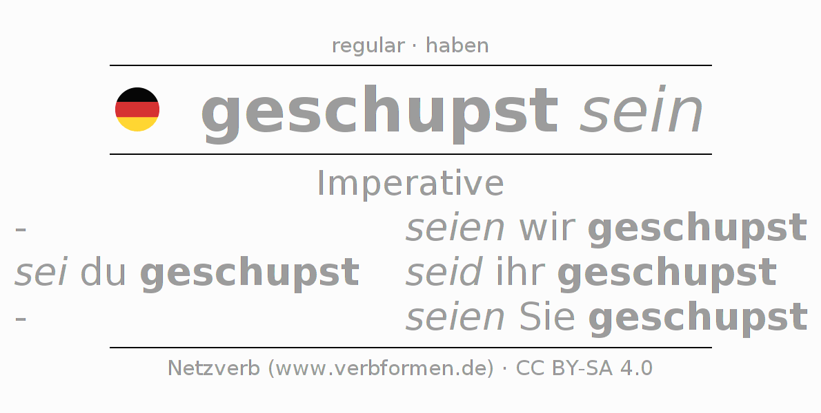 The conjugation of schupsen in Imperative Present Imperative Statal Passive is sei (du) geschupst, seien wir geschupst, seid (ihr) geschupst, seien Sie geschupst.The conjugation corresponds to certain grammatical rules. Likewise the requirements for the conjugation of the simple verb forms of schupsen in Imperative. Comments ☆