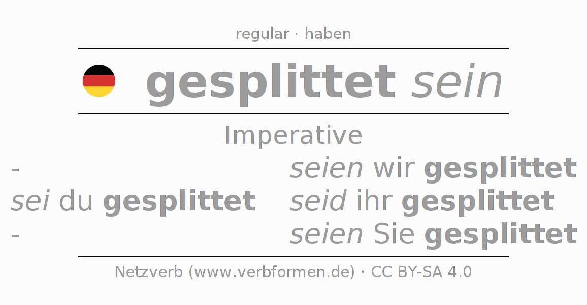 The conjugation of splitten in Imperative Present Imperative Statal Passive is sei (du) gesplittet, seien wir gesplittet, seid (ihr) gesplittet, seien Sie gesplittet.The conjugation corresponds to certain grammatical rules. Likewise the requirements for the conjugation of the simple verb forms of splitten in Imperative. Comments ☆