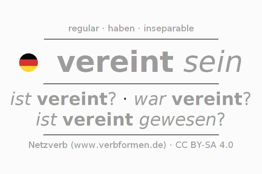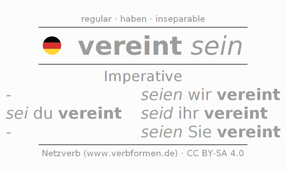 The verb vereinen fully conjugated in all persons and numbers in the Imperative Present